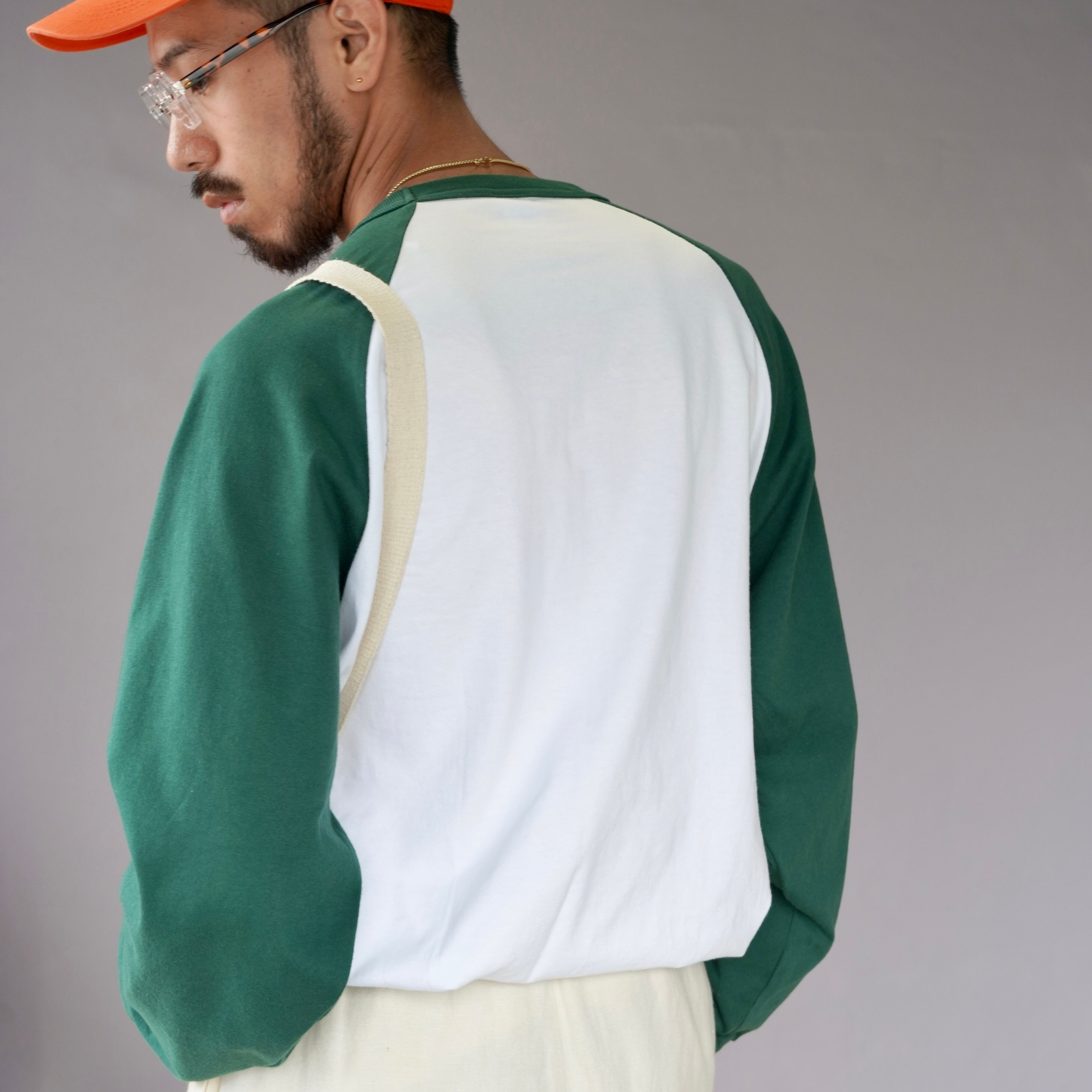 ・おすすめスタイリング:夏はカジュアルなハーフパンツで合わせたい。ラグランの長袖部分のダークグリーンがポイントになり目線を引くので、ボトムスはハーフにしてあげるとそこで足し引き算ができてバランス◎
