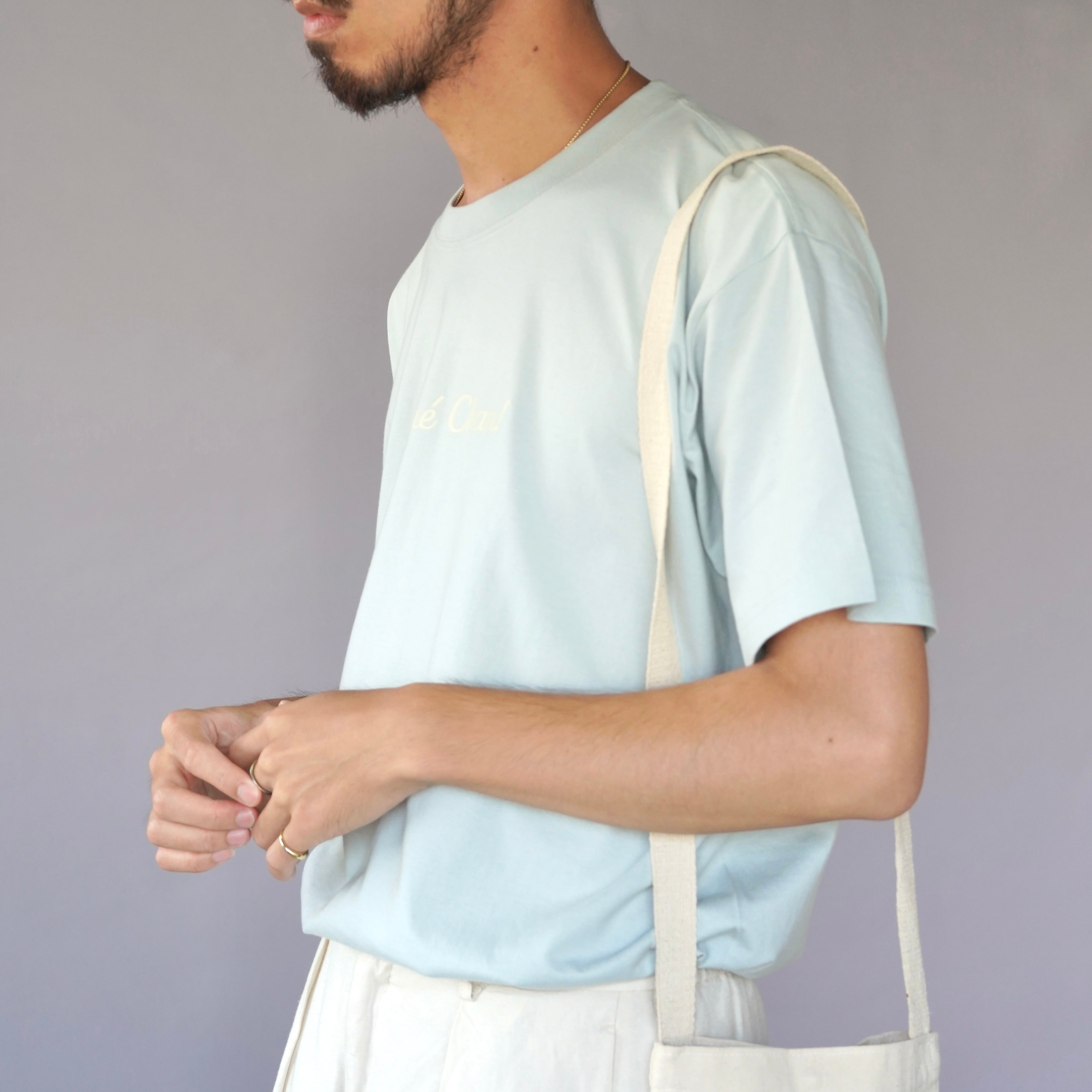 こちらはスモーキーブルーとは違う種類のTシャツで、生地はオーガニックコットン100%。なめらかで、ほのかに光沢感があります。